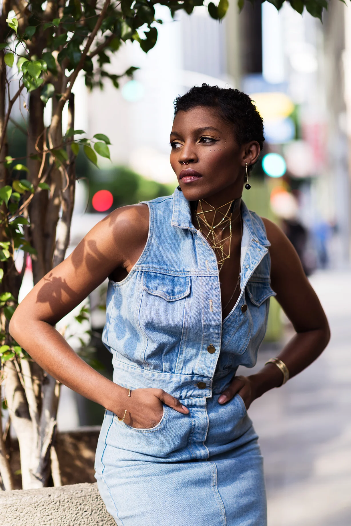 I scored this vintage denim jumper at this dope pop up market I used to sell my jewelry at called FamPop (shout out to my fam Redgi Woods for making that happen) It was hanging on the rack waiting for me. I tried it on at it fit like a glove; it was obviously fate and I had to have it.